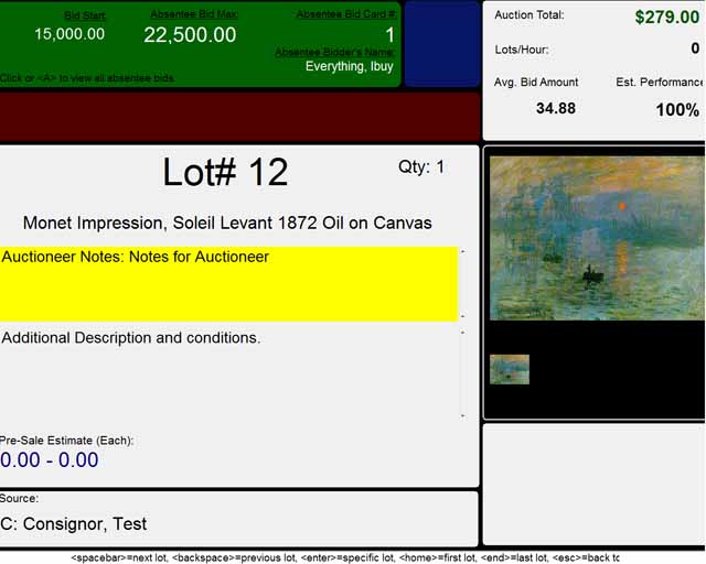 The Auctioneer's Screen is designed to be used from a computer at the auctioneer's podium. This computer should be networked with the other Auction Flex computers to be most effective, though it can be run as a stand-alone if necessary. The auctioneer controls what lot they are viewing utilizing keyboard shortcuts to navigate through the catalog.